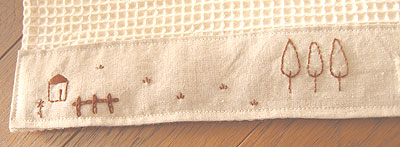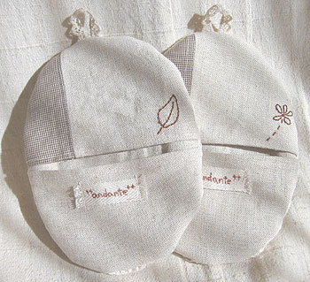 リネンの刺繍糸と皮ボタンで刺繍。
